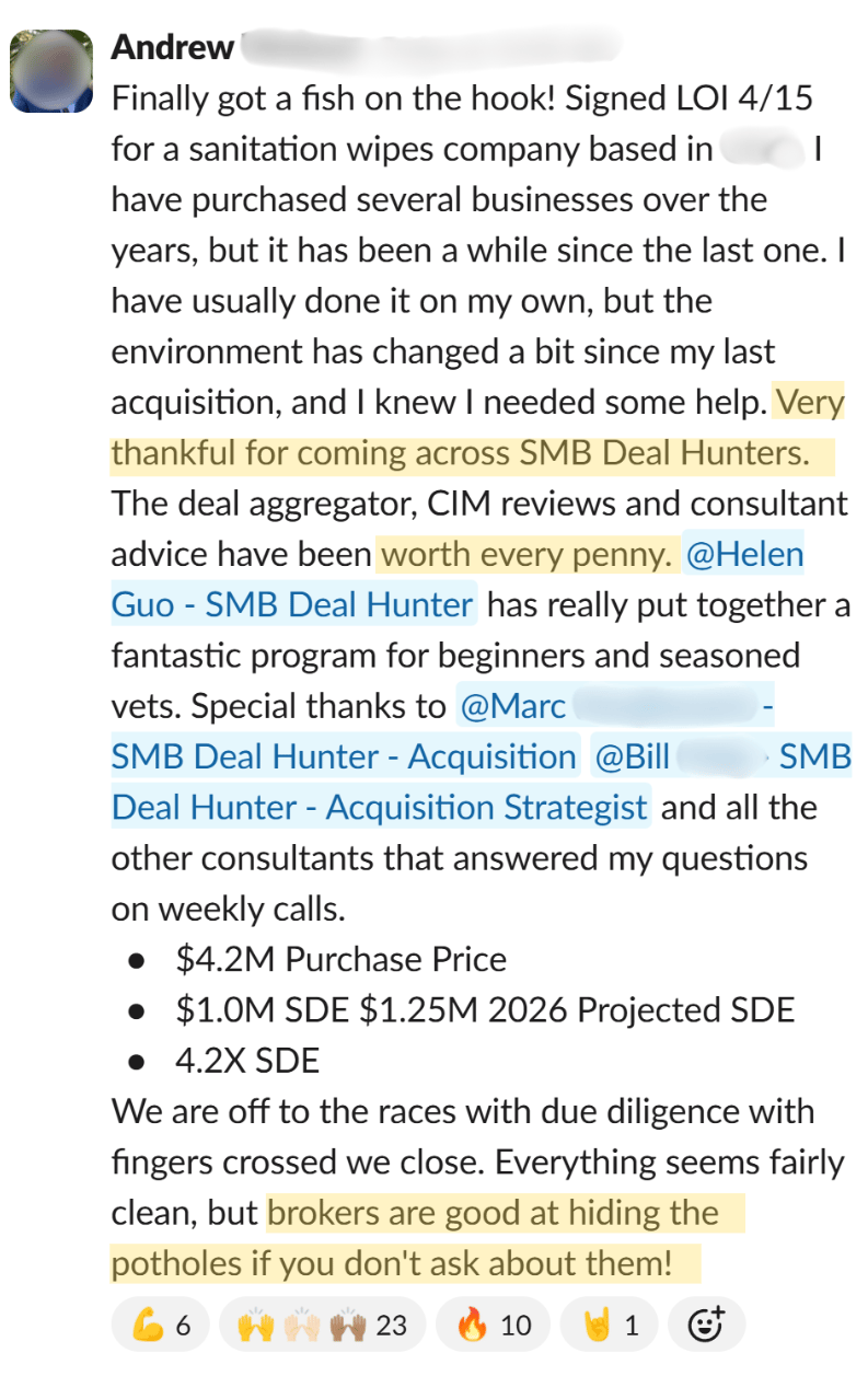 That's when he joined SMB Deal Hunter Pro. Five months in, he landed his first LOI. It fell apart. Then a second LOI. That one fell apart too.