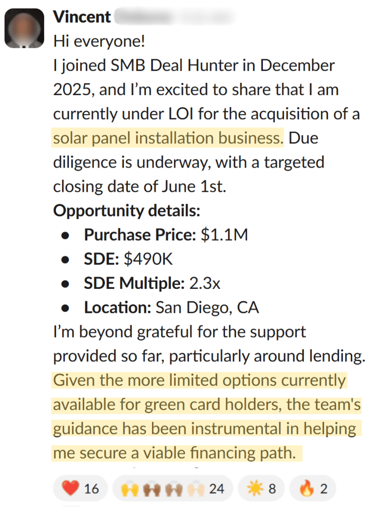 • Raising capital for your deal? I’ll connect you with investors from the SMB Deal Hunter Community.